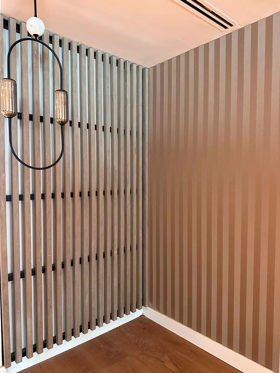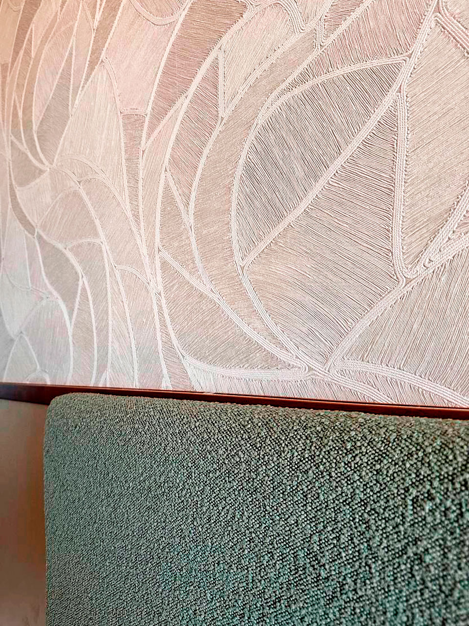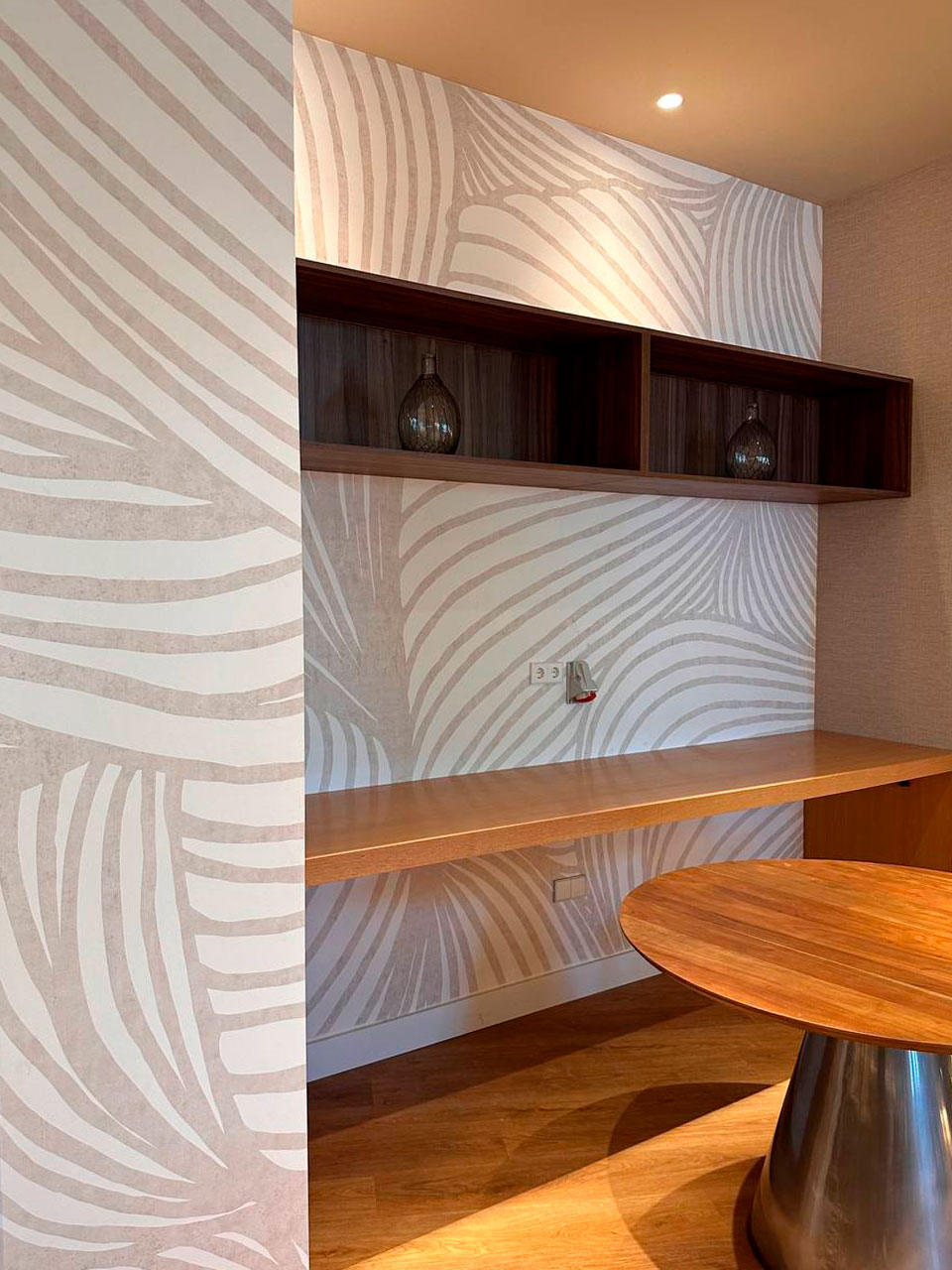 Para este proyecto se han instalado papeles de las firmas Vescom, Casamance y Arte. En DecorCentral contamos con una extensa gama, tanto de este tipo de papel pintado como de murales y papeles pintados de uso común.