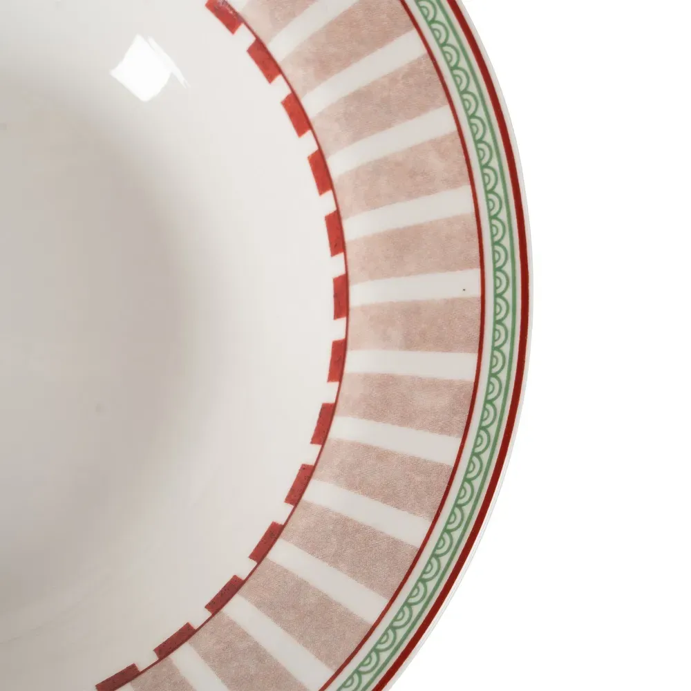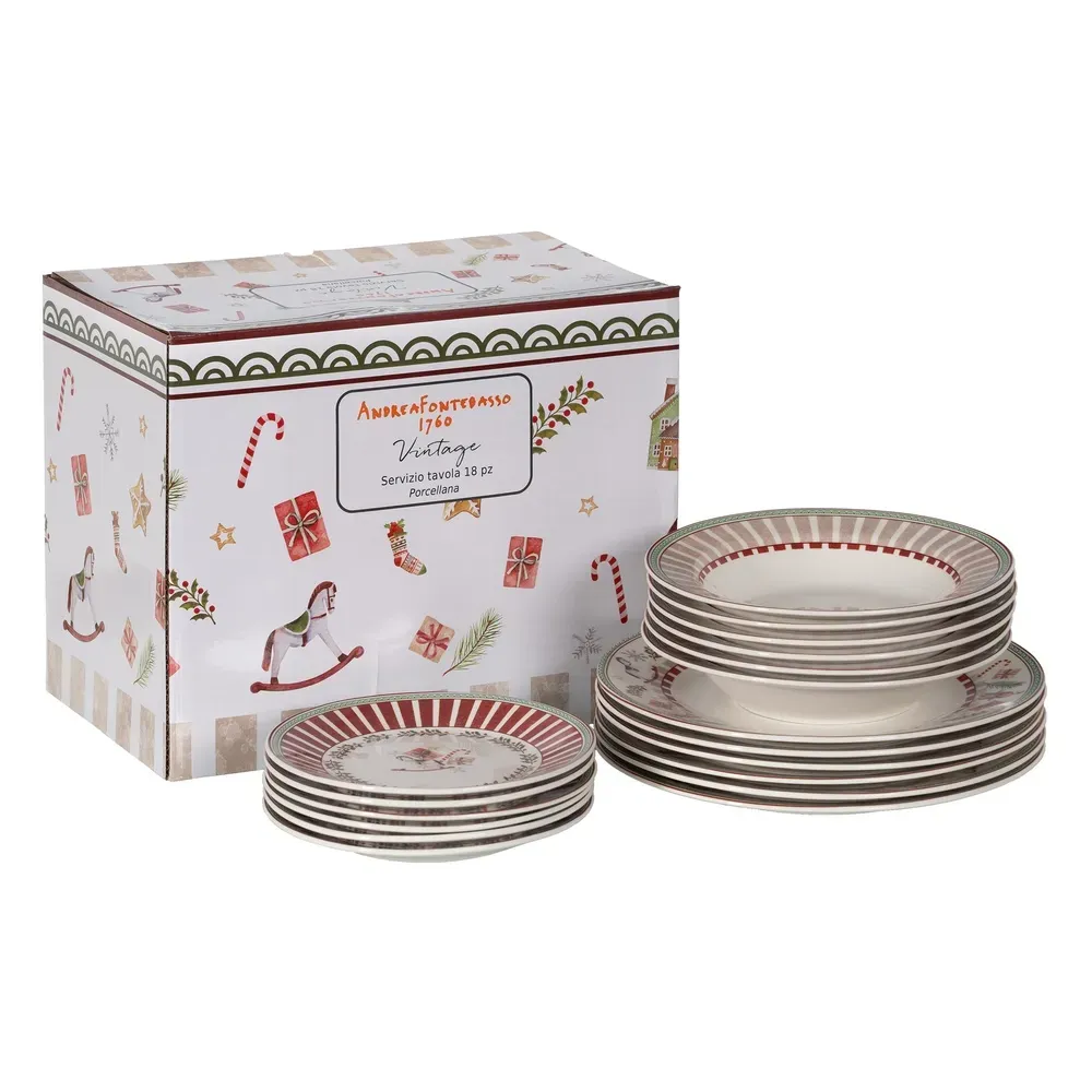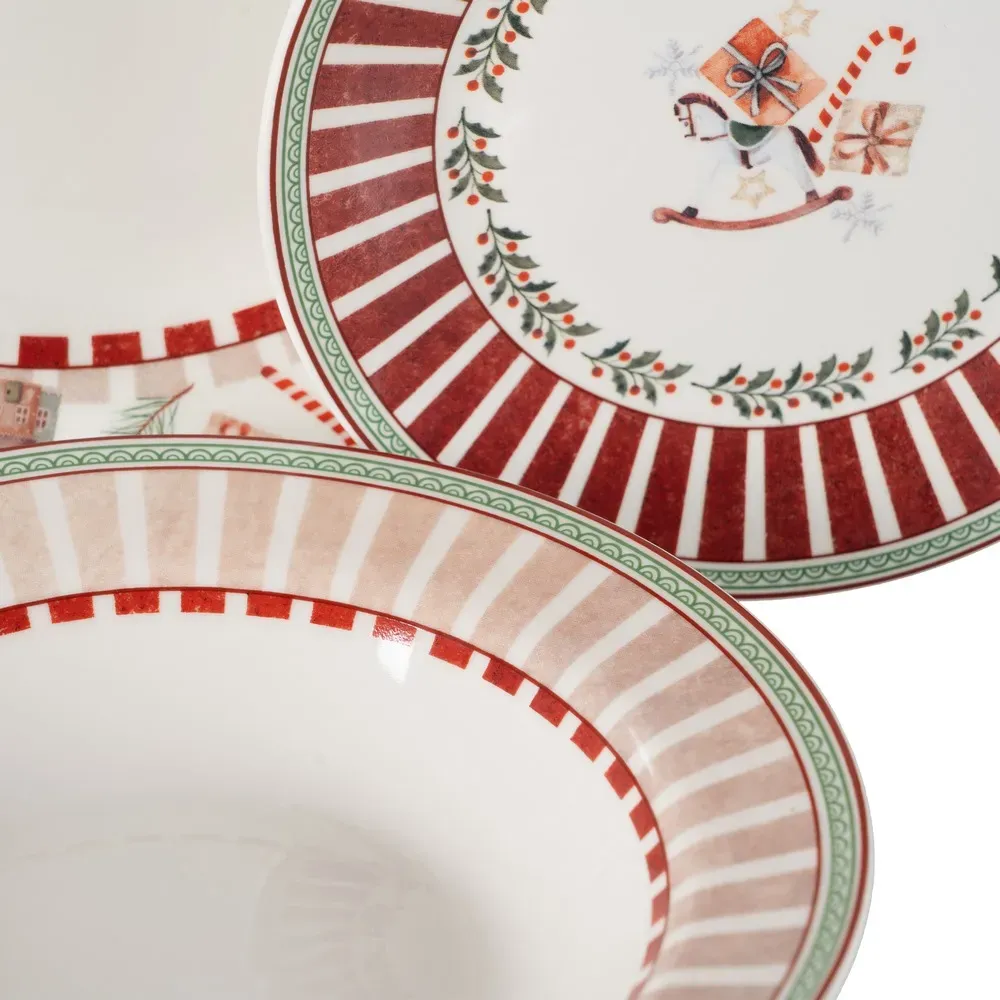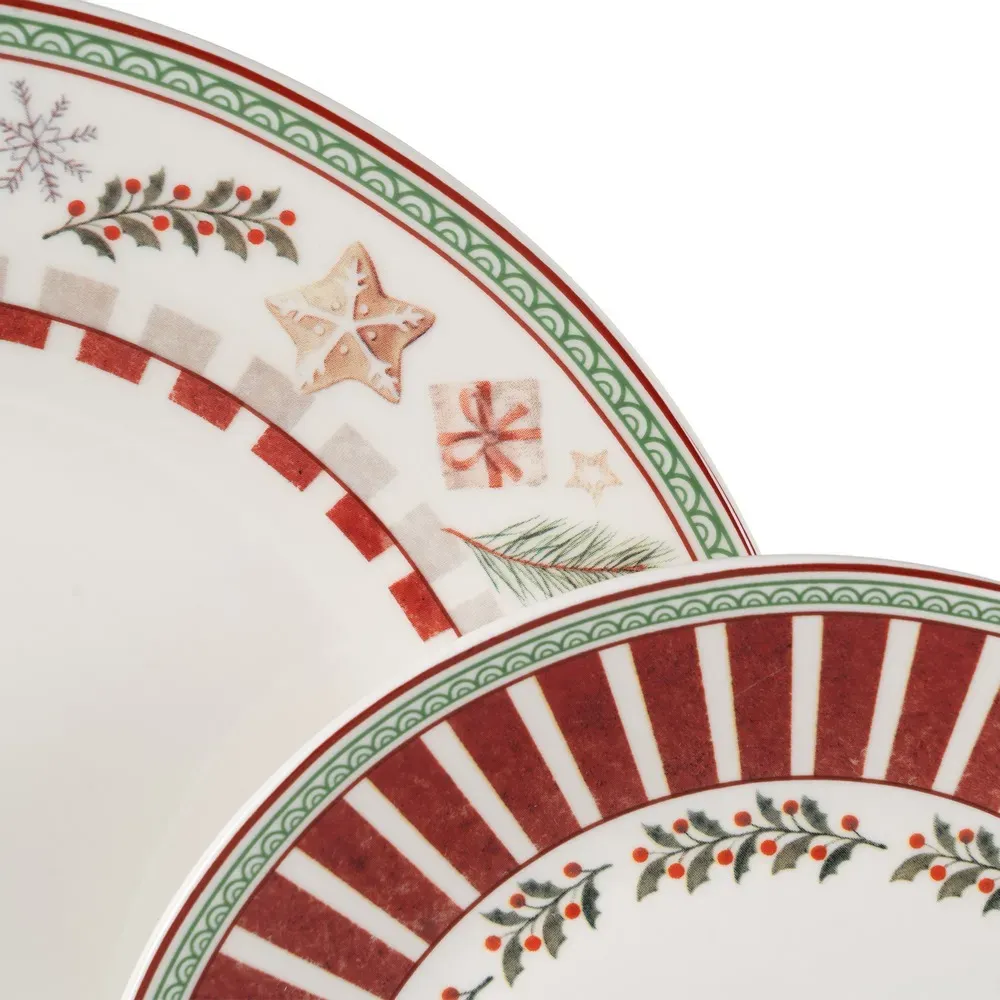Material: porcelana. Incluye 6 platos llanos, 6 platos hondos y 6 platos de postre. Apto para lavavajillas y microondas.