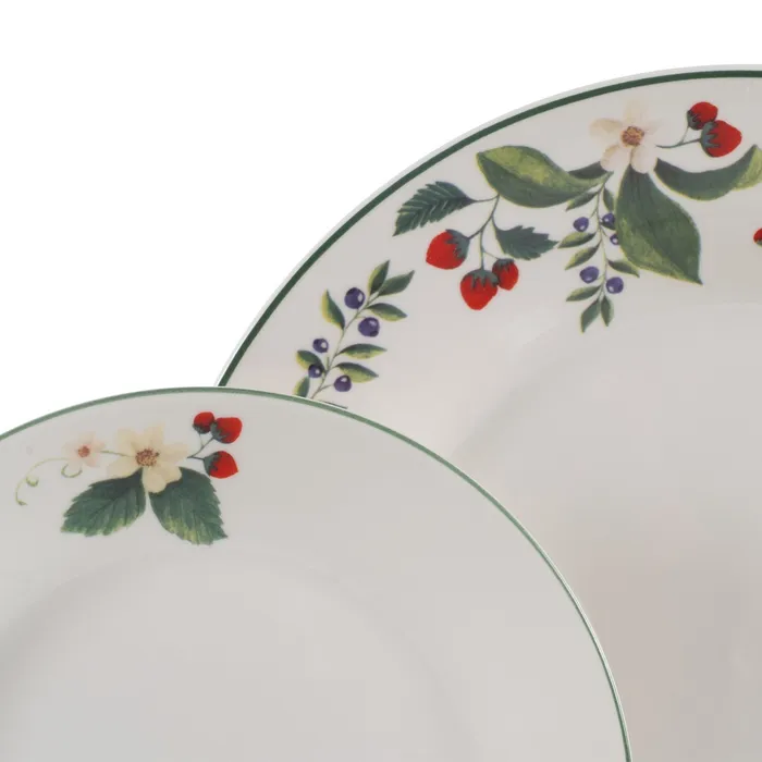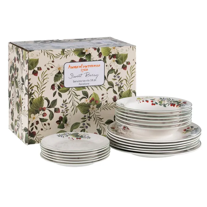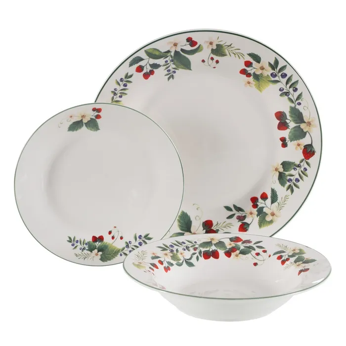 Material: porcelana. Incluye 6 platos llanos (diám.27cm*2,5cm) 6 platos hondos (diám. 22cm* 4,5cm) y 6 platos de postre (diám. 19cm*2cm). Apto para lavavajillas y microondas. No apto para canal HORECA.