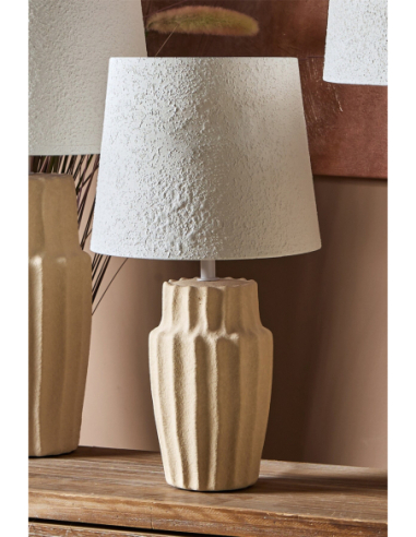 Lámpara de sobremesa Mesana 37 cm, se distingue por su base de cerámica con relieves y pantalla en tela pintada que difunde la luz de manera delicada. Perfecta para espacios reducidos que buscan un detalle de estilo, resulta muy funcional en mesas auxiliares o escritorios. Su diseño sencillo con textura artesanal convierte cualquier rincón en un lugar más cálido y personal. Aporta equilibrio entre funcionalidad y estética en la decoración. Es una opción ideal para quienes disfrutan de ambientes acogedores y bien iluminados.