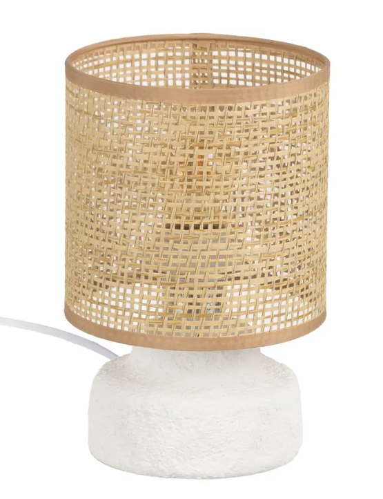 Base de cerámica, medidas 12,5×12,5x8cm. Pantalla de fibra de papel y PVC, medidas 15x15x15cm. Voltios: 220-240V.