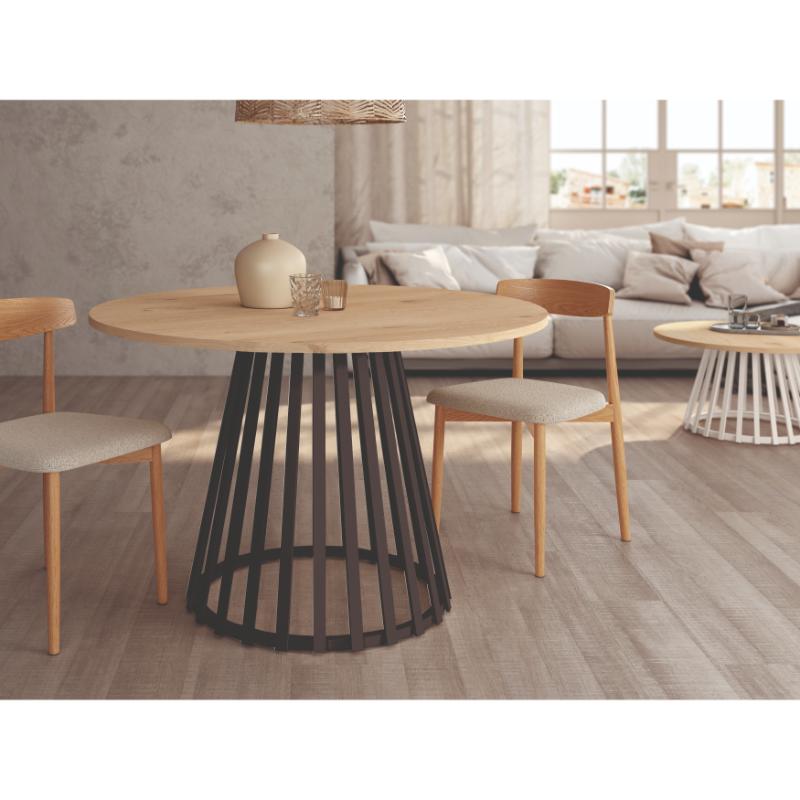 Mesa Comedor Delta 120 diámetro con sobre base de madera color roble y pata metal color negro.