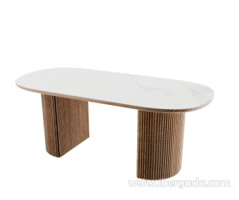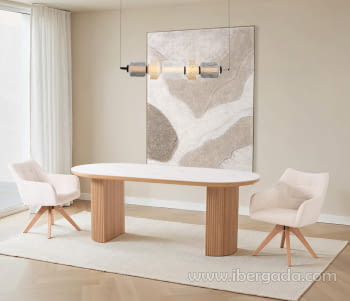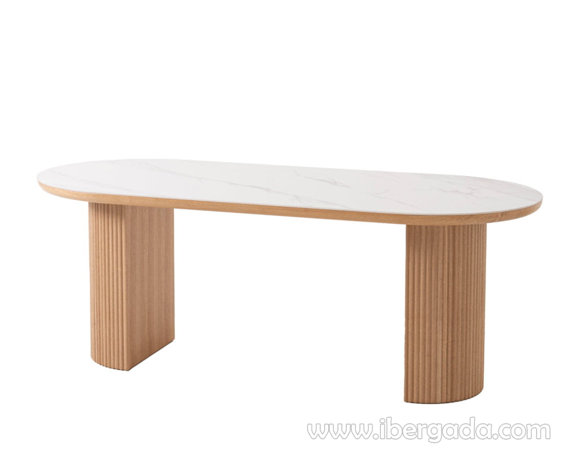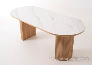 Mesa de comedor fija, realizada en chapa de roble y tapa de porcelánico color blanco beteado con forma ovalada.
