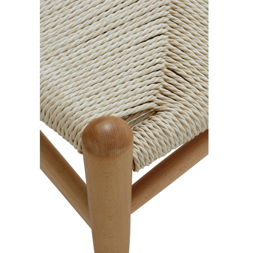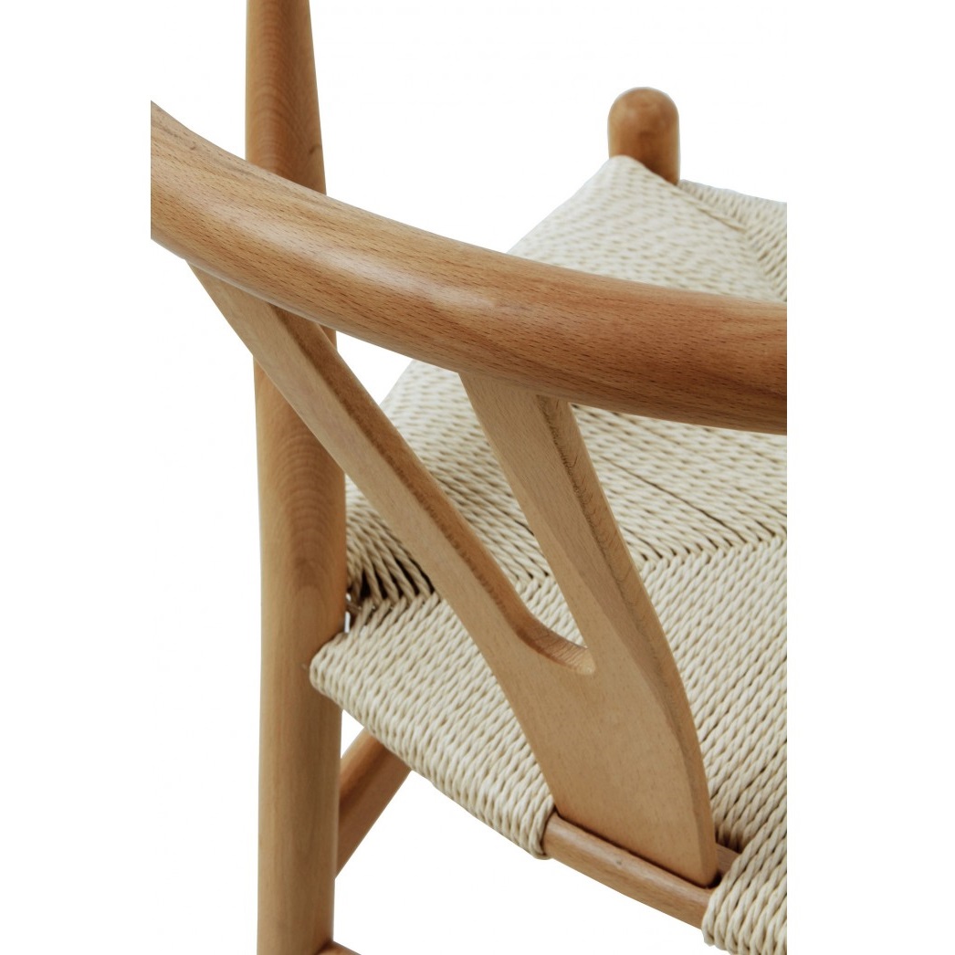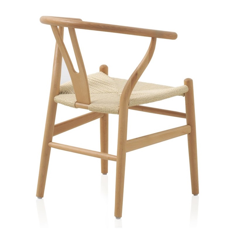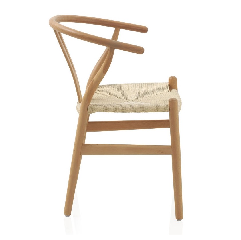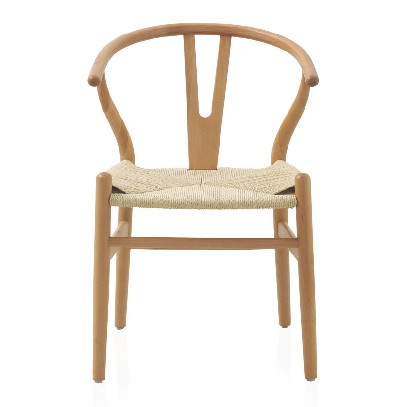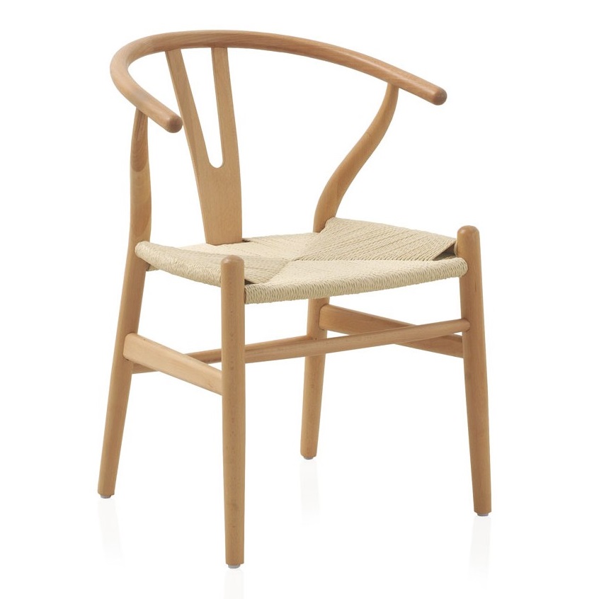 Irresistible silla, de diseño vintage e inspiración nórdica, inspirada en el icónico modelo Wishbone de Hans J. Wegner. Con estructura de madera maciza de haya en bonito acabado natural y original asiento de cuerda trenzada.