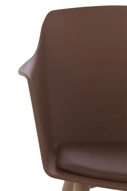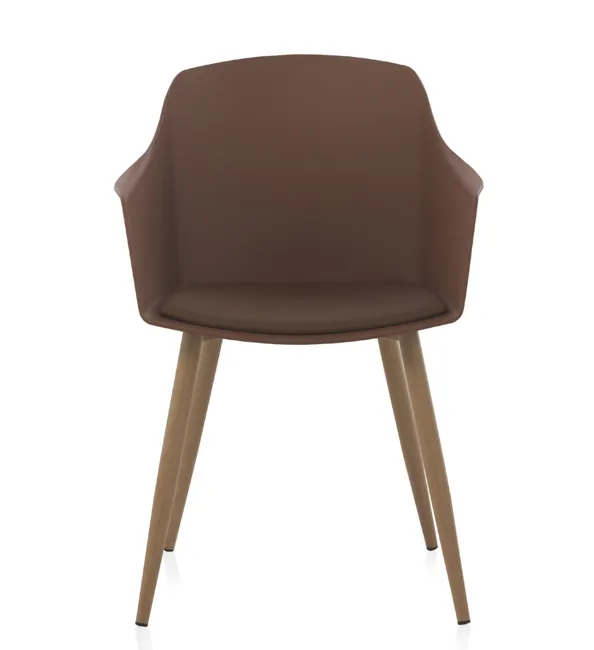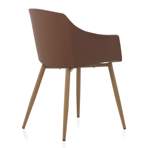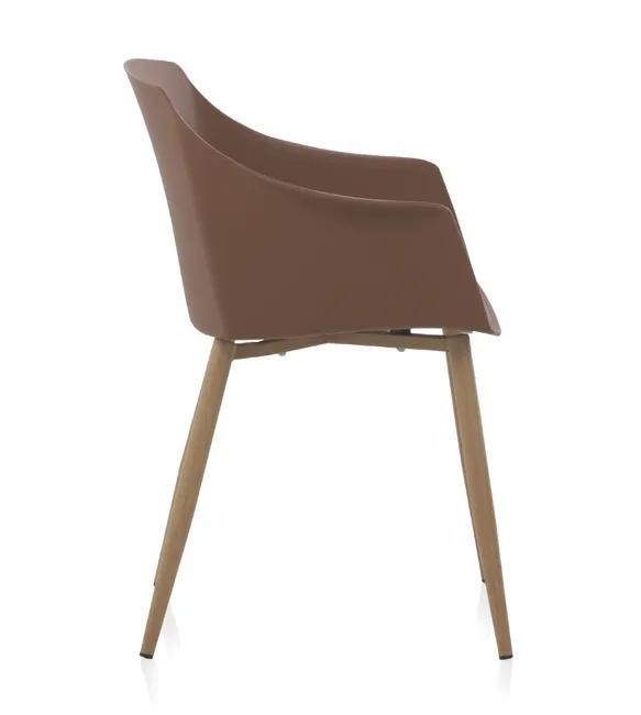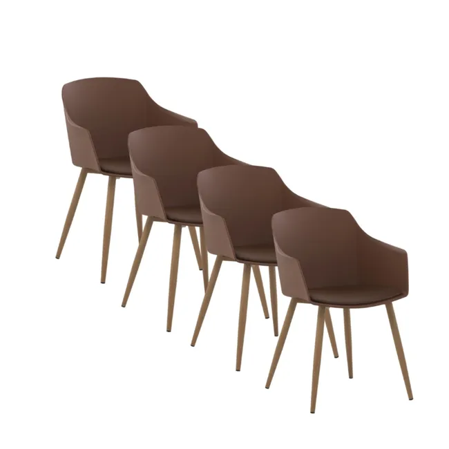 Set 4 sillones pp marrón con patas metálicas, compuesto por cuatro sillones de polipropileno marrón con un diseño contemporáneo y funcional. Cada sillón está equipado con un cómodo cojín acolchado de poliéster/algodón en color blanco, proporcionando una experiencia de asiento excepcionalmente confortable. Las patas metálicas en un tono natural, simulando la apariencia de la madera, añaden un toque de calidez y modernidad al conjunto. Estas patas no solo brindan estabilidad, sino que también complementan perfectamente el diseño general del set. La estructura de polipropileno blanco lisa es firme y duradera sin dejar la comodidad de lado.