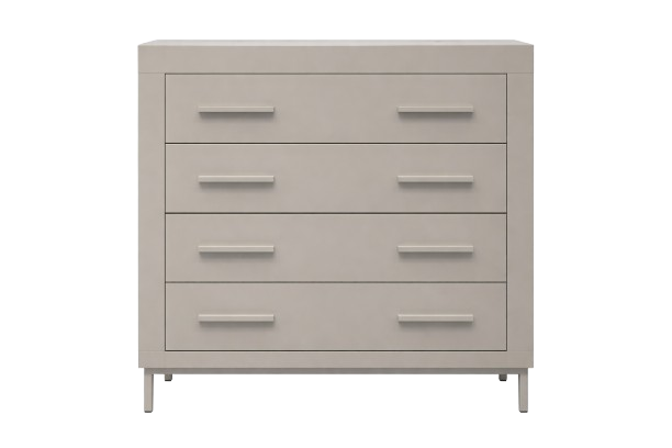 Cómoda moderna de cuatro cajones en color perla, con acabado liso y tiradores horizontales a juego. Su diseño recto y patas estilizadas aportan un estilo elegante y contemporáneo, ideal para dormitorios actuales.