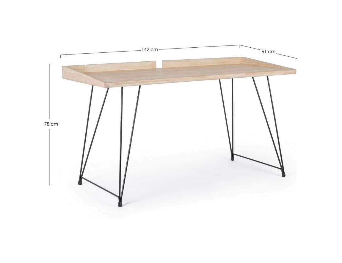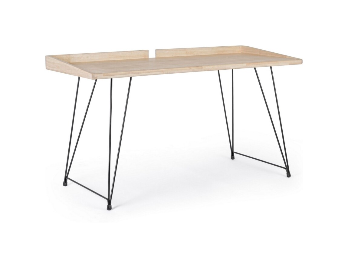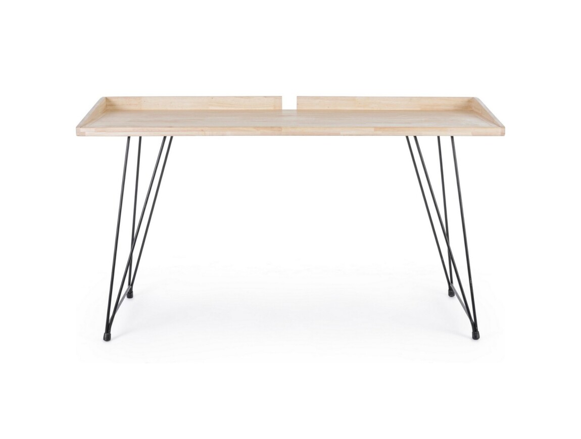 Las patas, para ensamblar, son de acero pintado y crean formas geométricas. El sobre es de madera de caucho con acabado encerado y están provistos de una cenefa lateral que recuerda a los pupitres escolares de época.