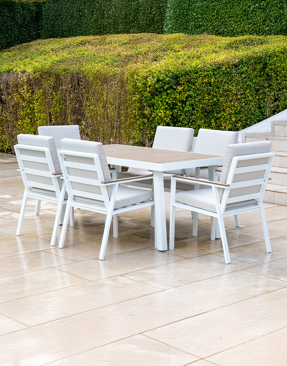Conjunto de comedor exterior compuesto por mesa y seis sillas.
