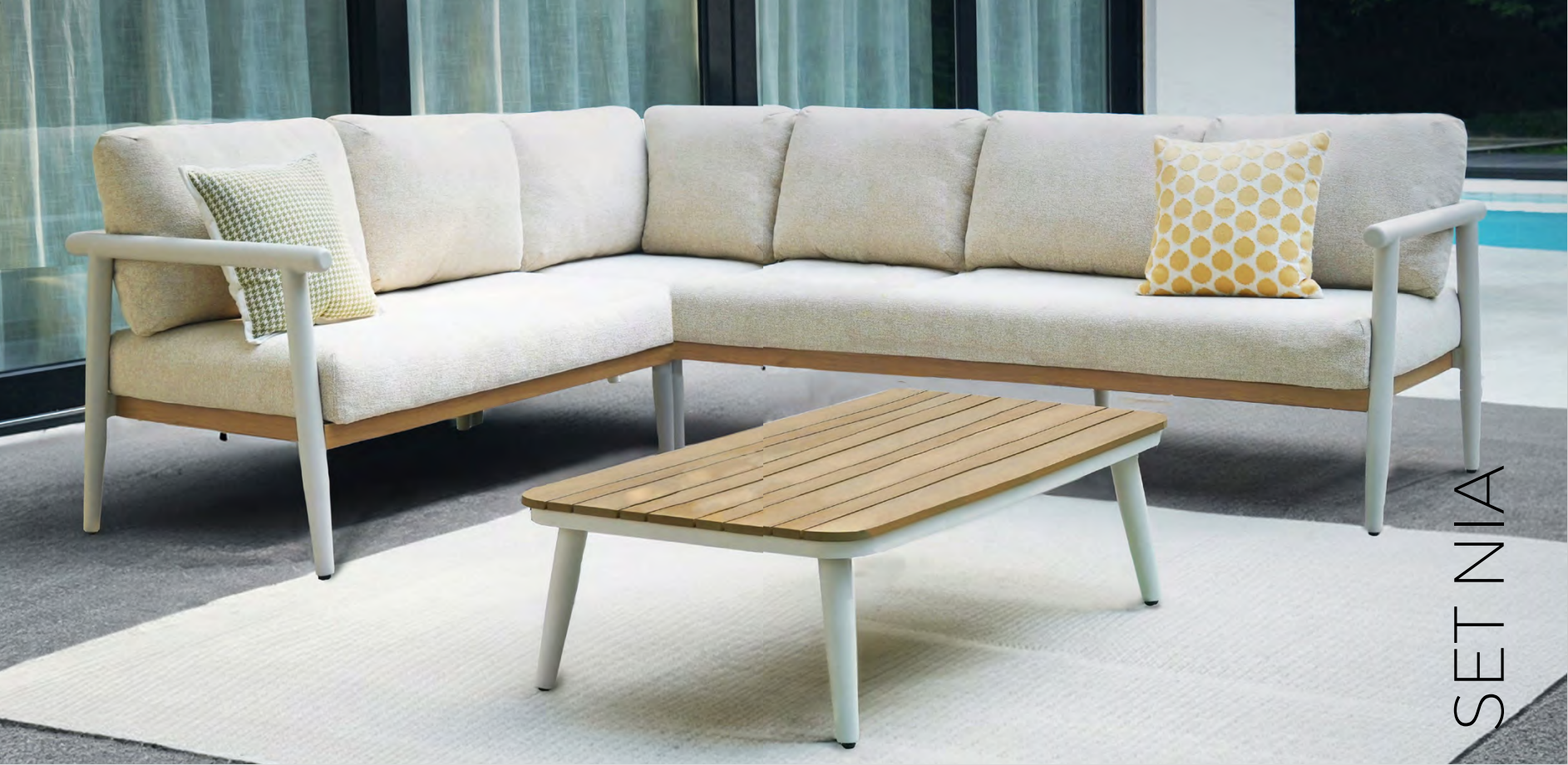 Set de aluminio blanco. Cojinería de color beige. Tablero de mesa y parte baja del sofá de resina imitación madera.