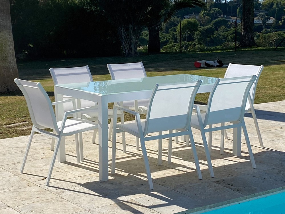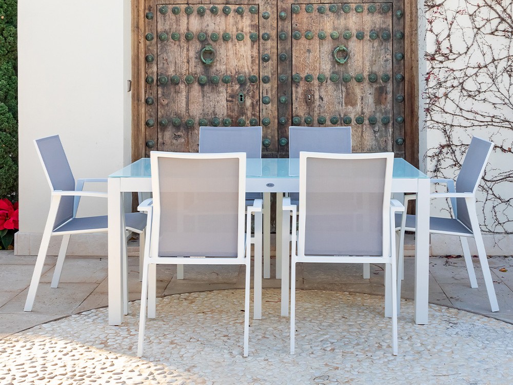 Mesa de comedor para exterior con estructura de aluminio blanco con sobre de cristal templado blanco.