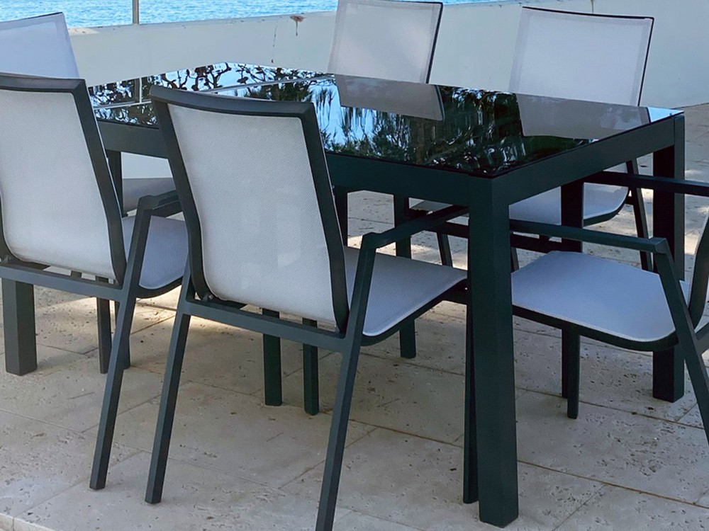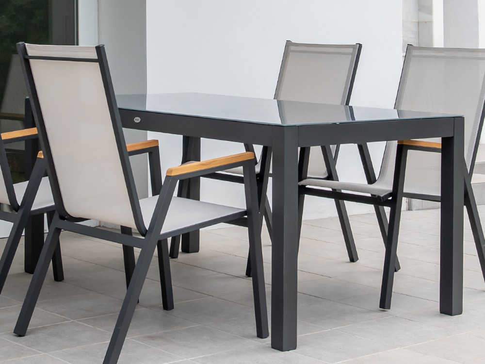 Mesa de comedor para exterior con estructura de aluminio antracita con sobre de cristal templado negro.