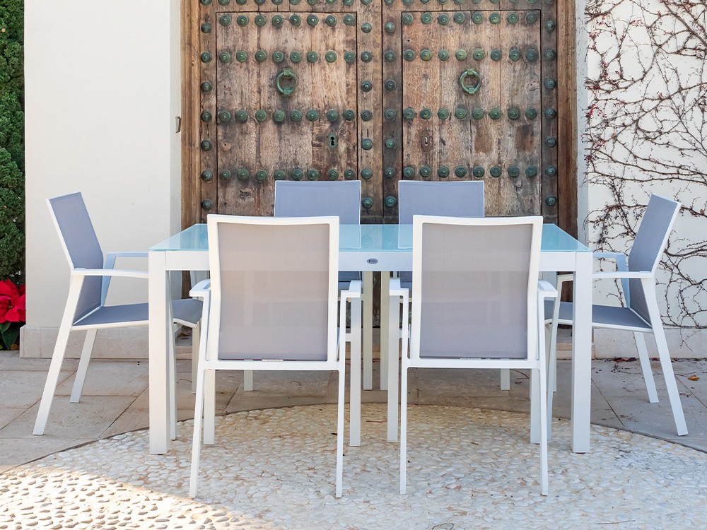 Textilene es un tejido artificial de malla transpirable, ideal para los días cálidos al aire libre. Es resistente y atractivo, muy fácil de limpiar y requiere poco mantenimiento, por es es perfecto para los muebles de exterior.