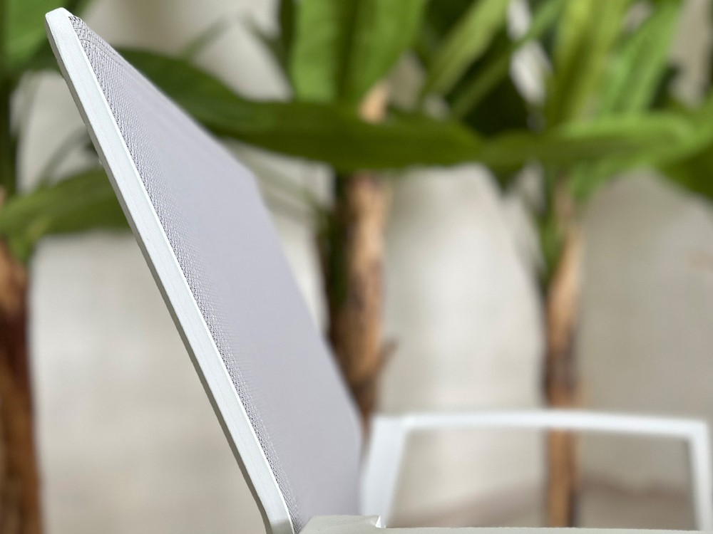 Silla de comedor exterior de aluminio blanco con asiento de textilene en color gris.