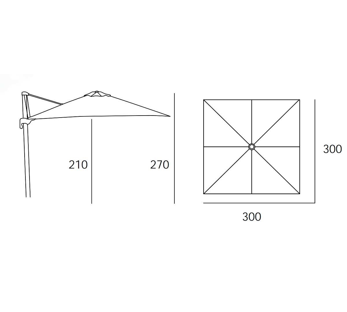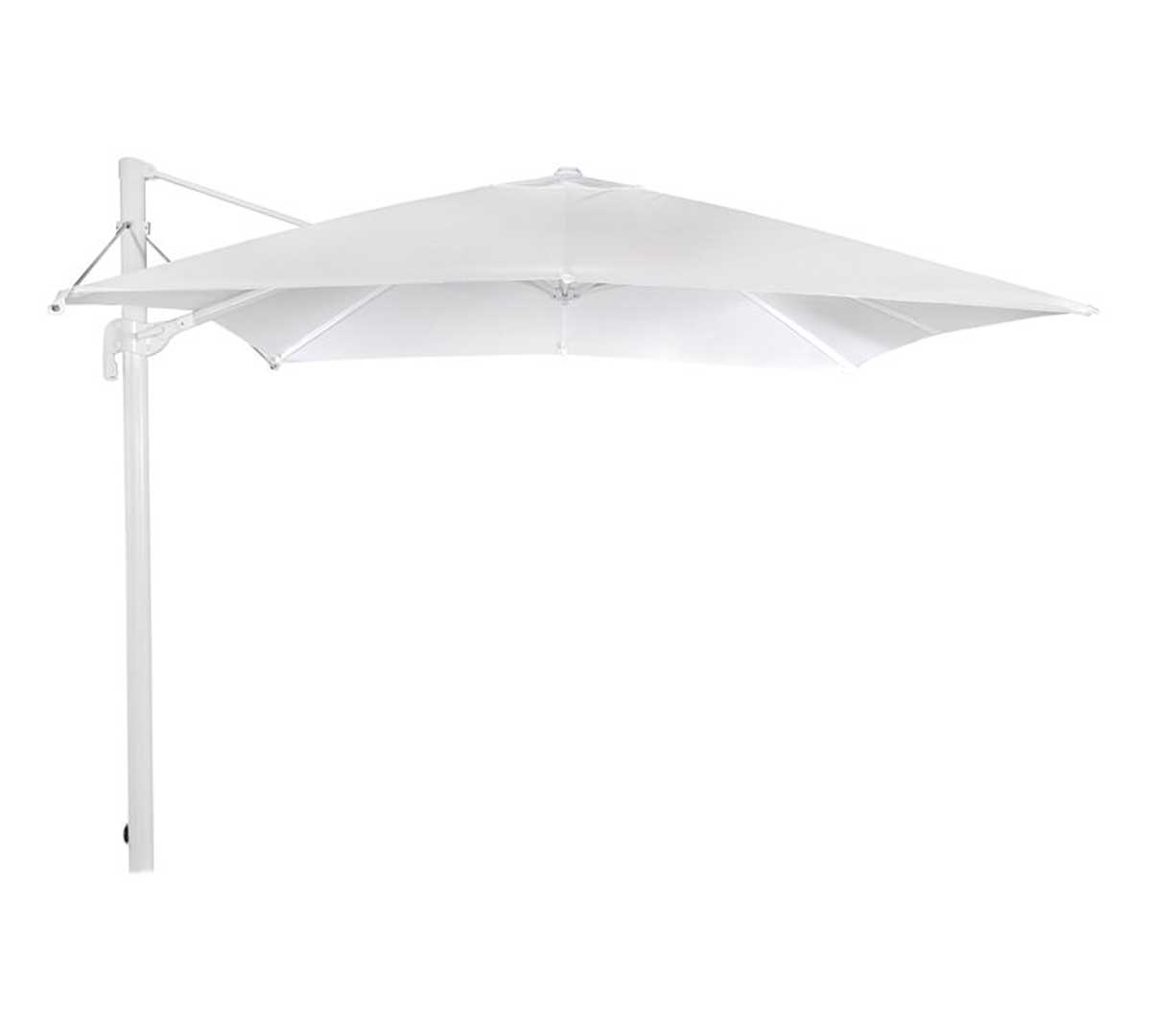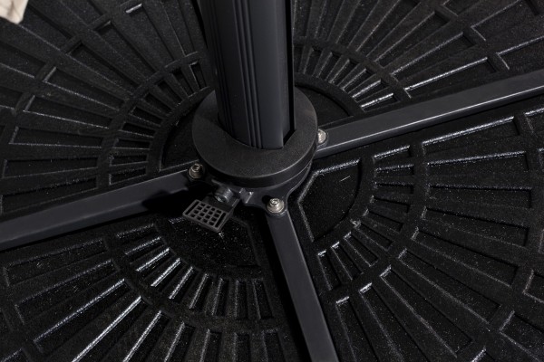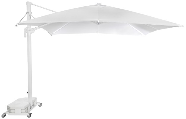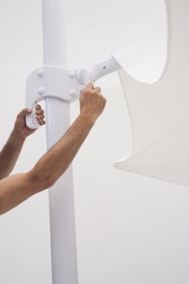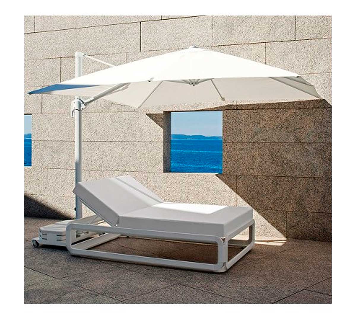 Parasol de aluminio de mastil lateral con inclinación. 8 varillas (17×25 mm). Sistema estabilizador. Con fugavientos. Confecionado con tejido OLEFIN fabricado con hilo de polipropileno que ha sido tintado en masa en su proceso inicial. Esto le otorga una gran resistencia a la luz solar ya que el color queda fijado en el hilo del tejido con mayor intensidad que en otros procesos. Certificación UV standars 801 con una puntuación UPF 80, que garantiza la protección de la piel de los efectos nocivos de los rayos UV. Resistente a las manchas, 100% reciclable. Base no incluida. Muy fácil de lavar y desinfectar. Producto de uso público y doméstico.
