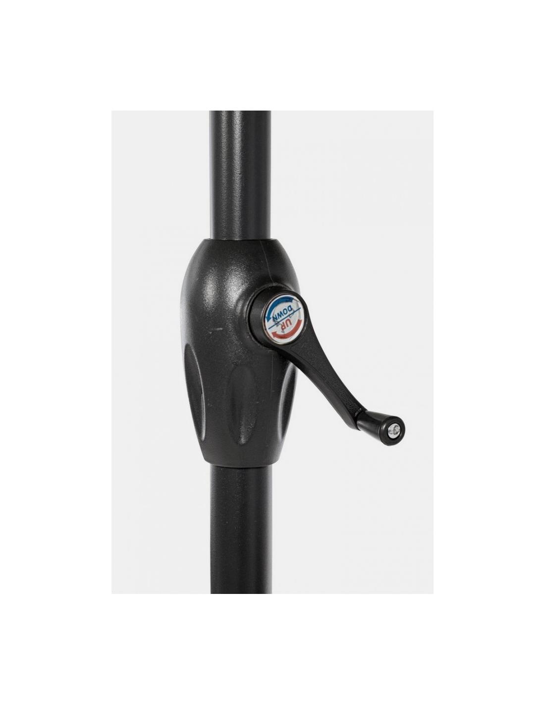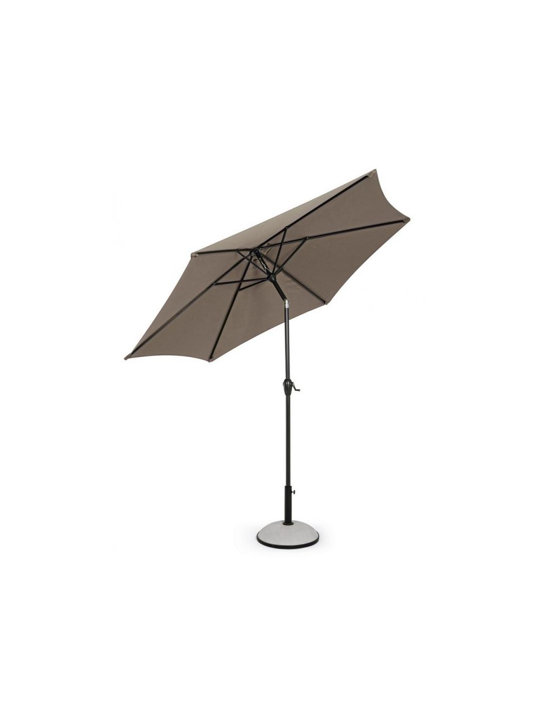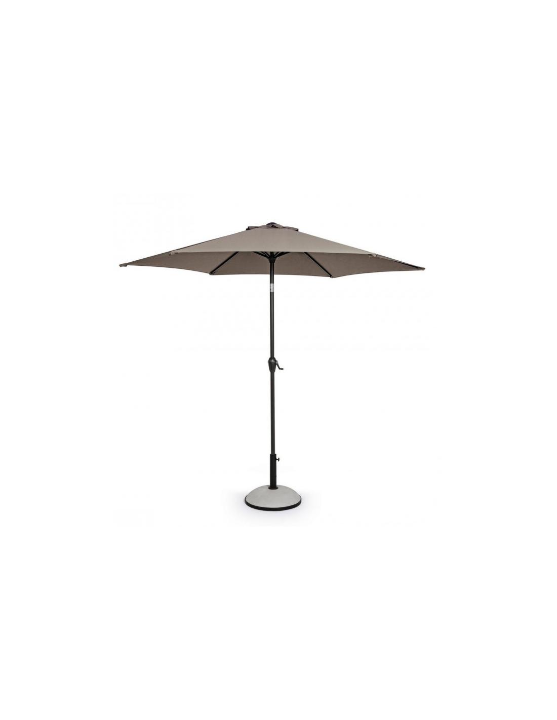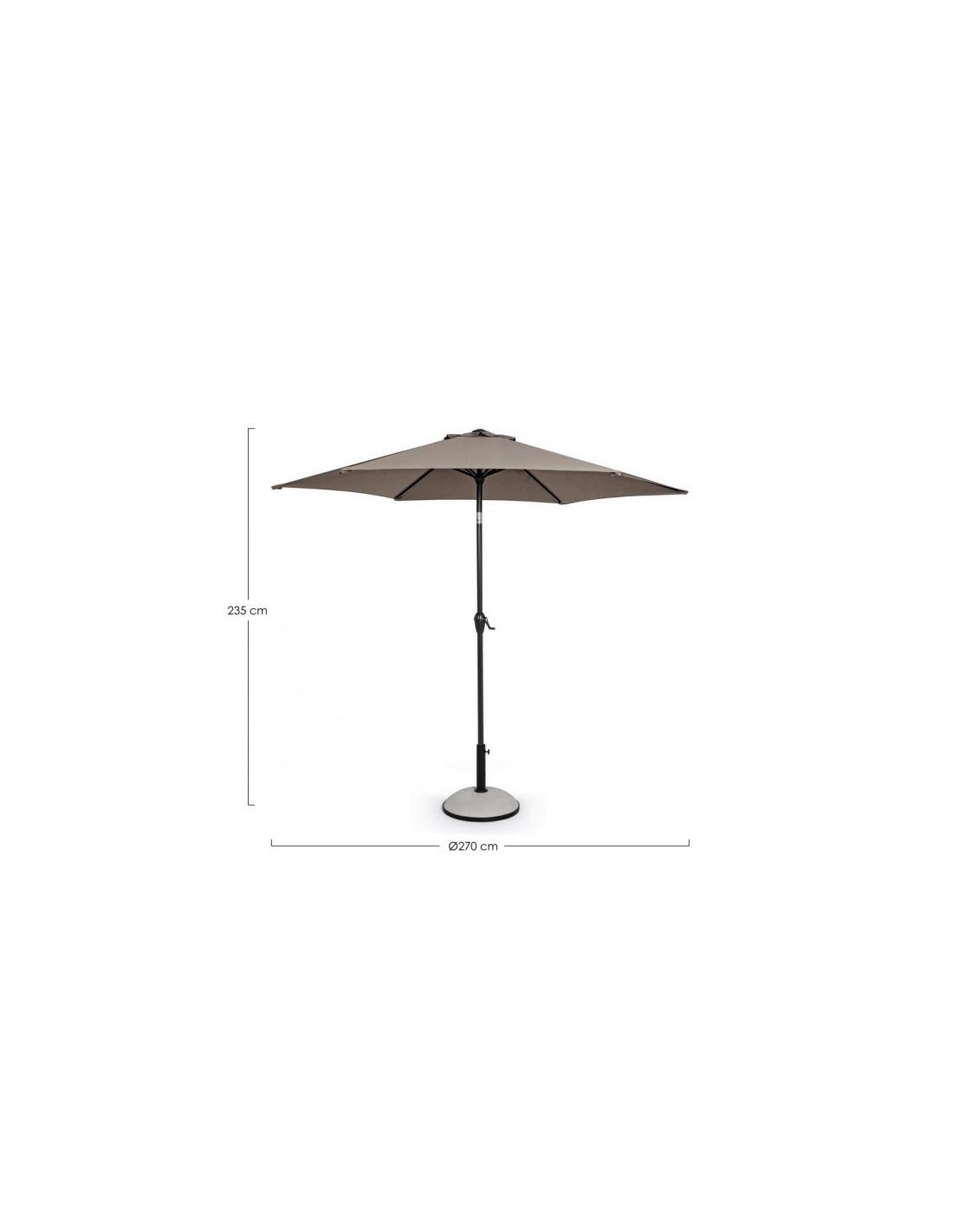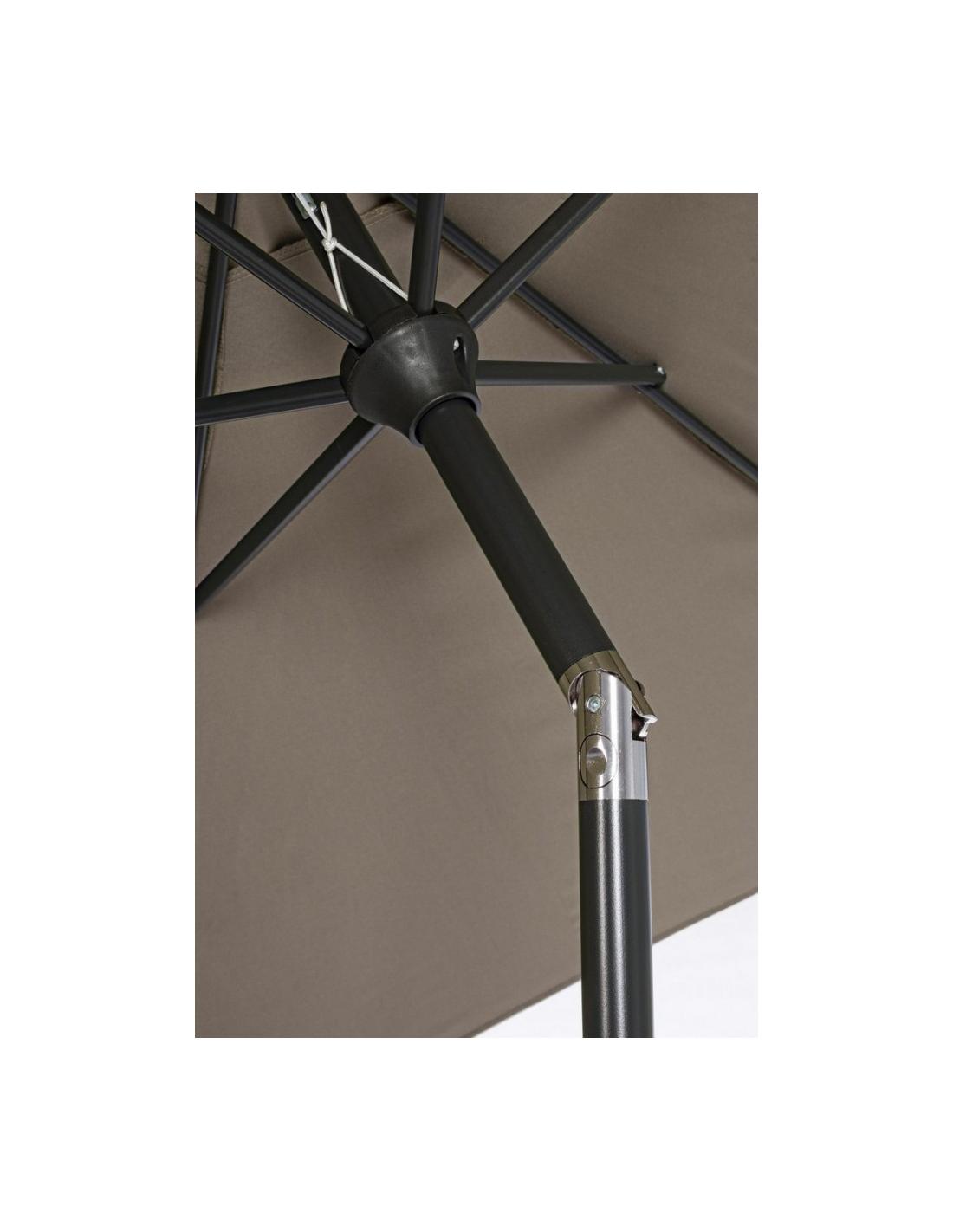 Estructura con revestimiento en polvo (poliéster). Mastil de aluminio ø36/38mm con inclinación. 6 varillas de acero tratado para exterior mediante fosfatación 12x18mm. Lona de poliéster color visón 160gr/m2 con chimenea cortaviento. Base no incluida.
