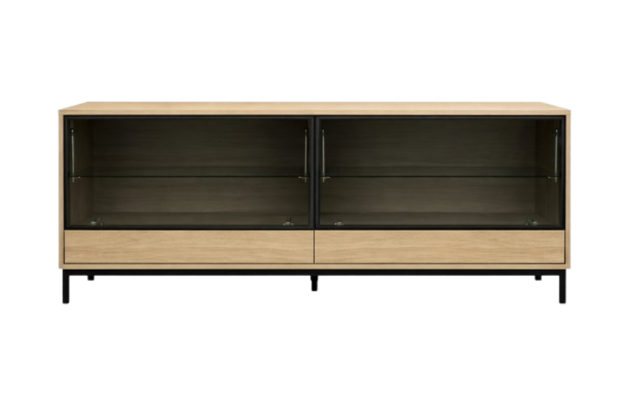 Aparador moderno en acabado roble claro, con puertas de cristal tintado y marco metálico negro. Incorpora gavetas inferiores amplias para mayor capacidad de almacenamiento, todo sobre una estructura elevada con patas negras y fondo blanco.