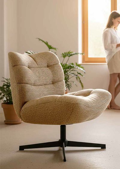 La butaca Vega está diseñada para disfrutar del descanso con total libertad de movimiento. Su sistema giratorio 360° permite moverte cómodamente, mientras su diseño tapizado ofrece una sentada confortable y acogedora.