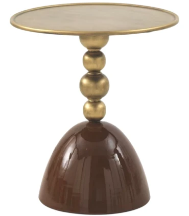 Esta mesa auxiliar de metal combina un elegante acabado dorado con una base semicircular en marrón brillante, ofreciendo un diseño moderno y escultórico que destaca en cualquier espacio. Su estructura robusta y compacta la convierte en una pieza decorativa perfecta para salones, recibidores o dormitorios, ideal para colocar una lámpara, libros o accesorios decorativos.