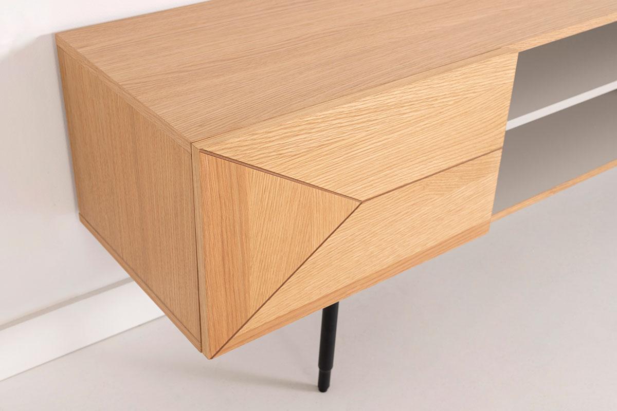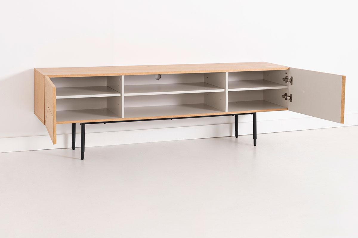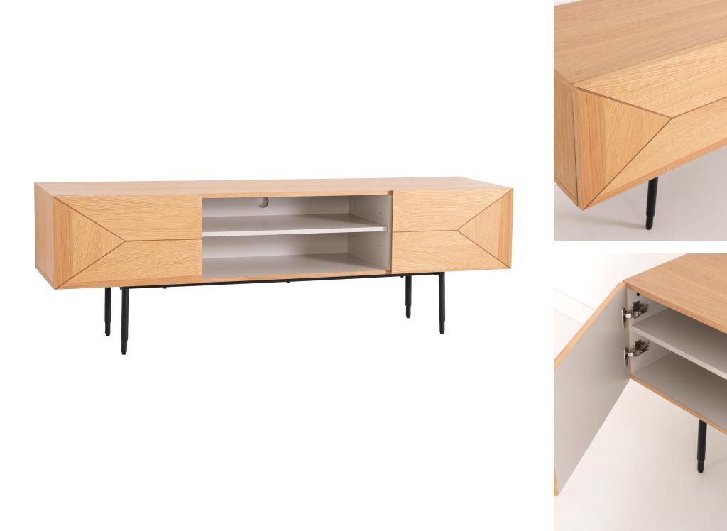 MUEBLE TV KALMAR 180*40*58 CM. CHAPA DE ROBLE NATURAL Y LACADO AQUAMARINA. PATAS METAL NEGRO (KIT)