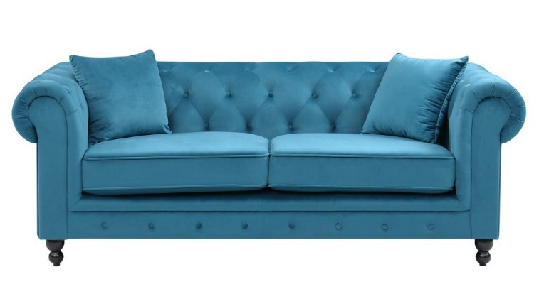 Sofá modelo chéster terciopelo azul con patas de madera.