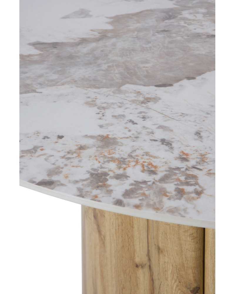 La mesa de comedor redonda tiene un diámetro de 140 cm y está diseñada en tablero de partículas de densidad media acabado en roble, combinada con una encimera de cerámica de 1 cm de grosor en color mármol Calacatta Gold, que le aporta elegancia y sofisticación. La superficie de la encimera es brillante, brindando un acabado pulido y moderno. Su estructura base es cilíndrica, también en tablero de partículas de densidad media chapado en madera de roble, con un diámetro de 70 cm, que proporciona estabilidad y estilo. La mesa requiere un montaje sencillo, lo que facilita su instalación y uso en cualquier espacio de comedor.